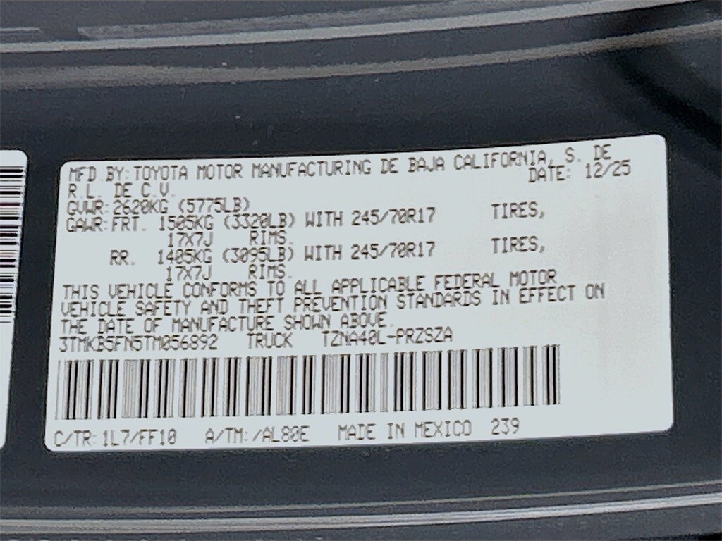 2026 Toyota Tacoma Underground RWD SR5 8-Speed Automatic 2.4L 4-Cylinder 3.583 Axle Ratio, 4-Wheel Disc Brakes, 6 Speakers, ABS brakes, Air Conditioning, Alloy wheels, AM/FM radio: SiriusXM, Anti-whiplash front head restraints, Apple CarPlay/Android Auto, Auto High-beam Headlights, Auto-dimming Rear-View mirror, Brake assist, Bumpers: body-color, Driver door bin, Dual front impact airbags, Dual front side impact airbags, Electronic Stability Control, Emergency communication system: Safety Connect (up to 10-year trial subscription), Exterior Parking Camera Rear, Fabric Seat Trim, Four wheel independent suspension, Front anti-roll bar, Front Bucket Seats, Front Center Armrest, Front fog lights, Front reading lights, Fully automatic headlights, Heated door mirrors, Illuminated entry, Knee airbag, Low tire pressure warning, Occupant sensing airbag, Outside temperature display, Overhead airbag, Overhead console, Panic alarm, Passenger door bin, Power door mirrors, Power steering, Power windows, Radio: 8" Toyota Audio Multimedia, Rear step bumper, Rear window defroster, Remote keyless entry, Speed control, Speed-sensing steering, Split folding rear seat, Spray-on Bed Liner, Steering wheel mounted audio controls, Tachometer, Telescoping steering wheel, Tilt steering wheel, Traction control, Trip computer, Variably intermittent wipers, Wheels: 17" Styled Alloy.