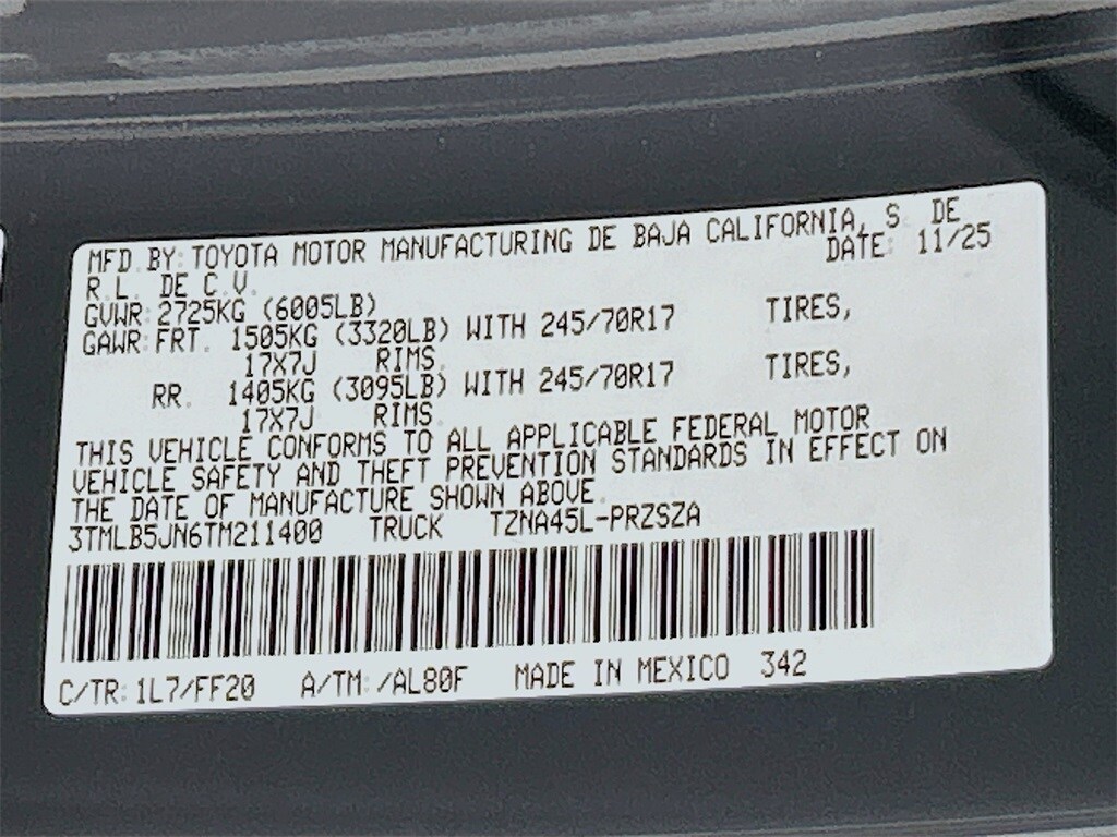 2026 Toyota Tacoma Underground 4WD TRD Sport 8-Speed Automatic 2.4L 4-Cylinder 4WD, 3.583 Axle Ratio, 4-Wheel Disc Brakes, 6 Speakers, ABS brakes, Air Conditioning, Alloy wheels, AM/FM radio: SiriusXM, Anti-whiplash front head restraints, Apple CarPlay/Android Auto, Auto High-beam Headlights, Auto-dimming Rear-View mirror, Automatic temperature control, Brake assist, Bumpers: body-color, Driver door bin, Driver vanity mirror, Dual front impact airbags, Dual front side impact airbags, Electronic Stability Control, Emergency communication system: Safety Connect (up to 10-year trial subscription), Exterior Parking Camera Rear, Fabric Seat Trim, Four wheel independent suspension, Front anti-roll bar, Front Bucket Seats, Front Center Armrest, Front fog lights, Front reading lights, Fully automatic headlights, Heated door mirrors, Illuminated entry, JBL Premium Audio, Knee airbag, Leather Shift Knob, Leather steering wheel, Low tire pressure warning, Occupant sensing airbag, Outside temperature display, Overhead airbag, Overhead console, Panic alarm, Passenger door bin, Passenger vanity mirror, Power door mirrors, Power steering, Power windows, Radio: 8" Toyota Audio Multimedia, Rear step bumper, Rear window defroster, Remote keyless entry, Security system, SofTex Seat Trim, Speed control, Speed-sensing steering, Split folding rear seat, Spray-on Bed Liner, Steering wheel mounted audio controls, Tachometer, Telescoping steering wheel, Tilt steering wheel, Traction control, Trip computer, Turn signal indicator mirrors, Variably intermittent wipers, Wheels: 18" TRD Sport Alloy, 4WD.