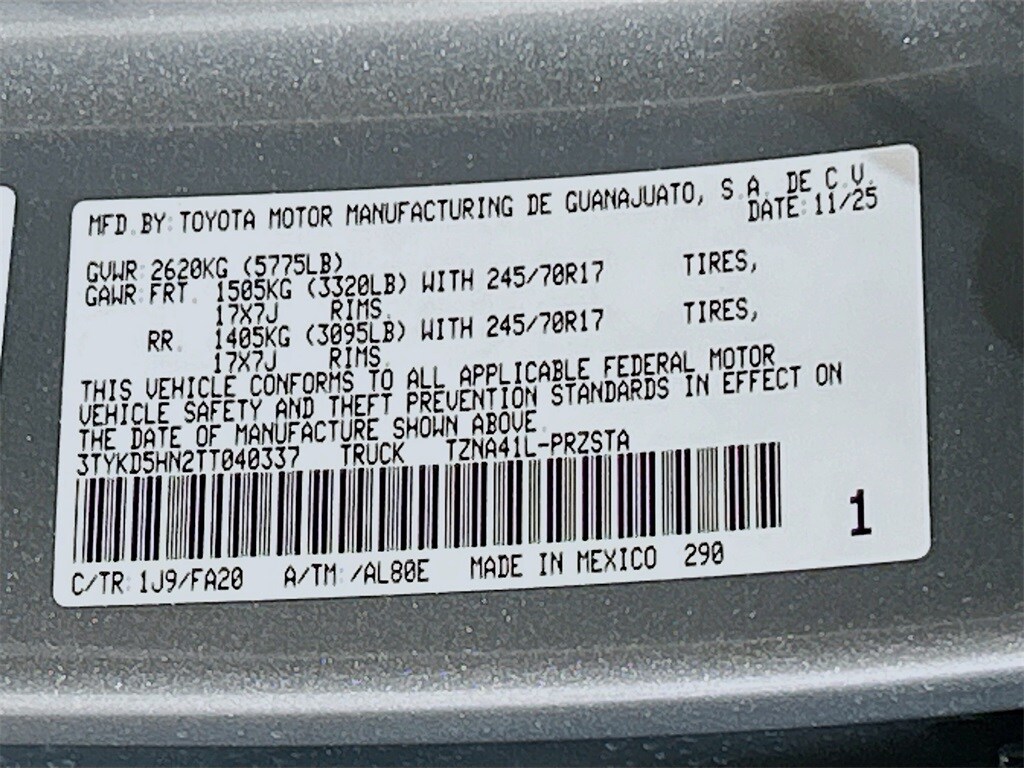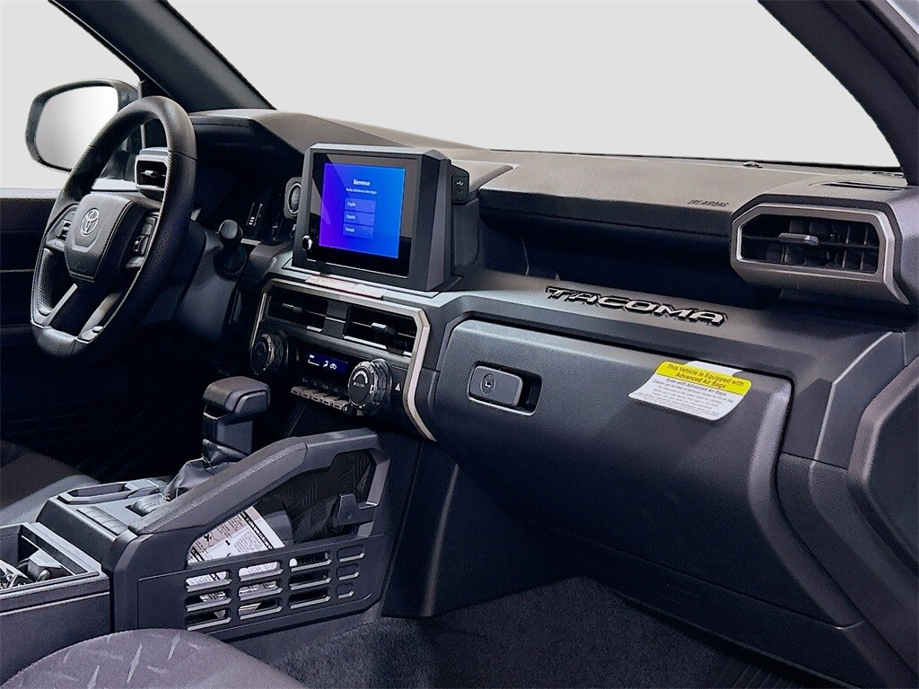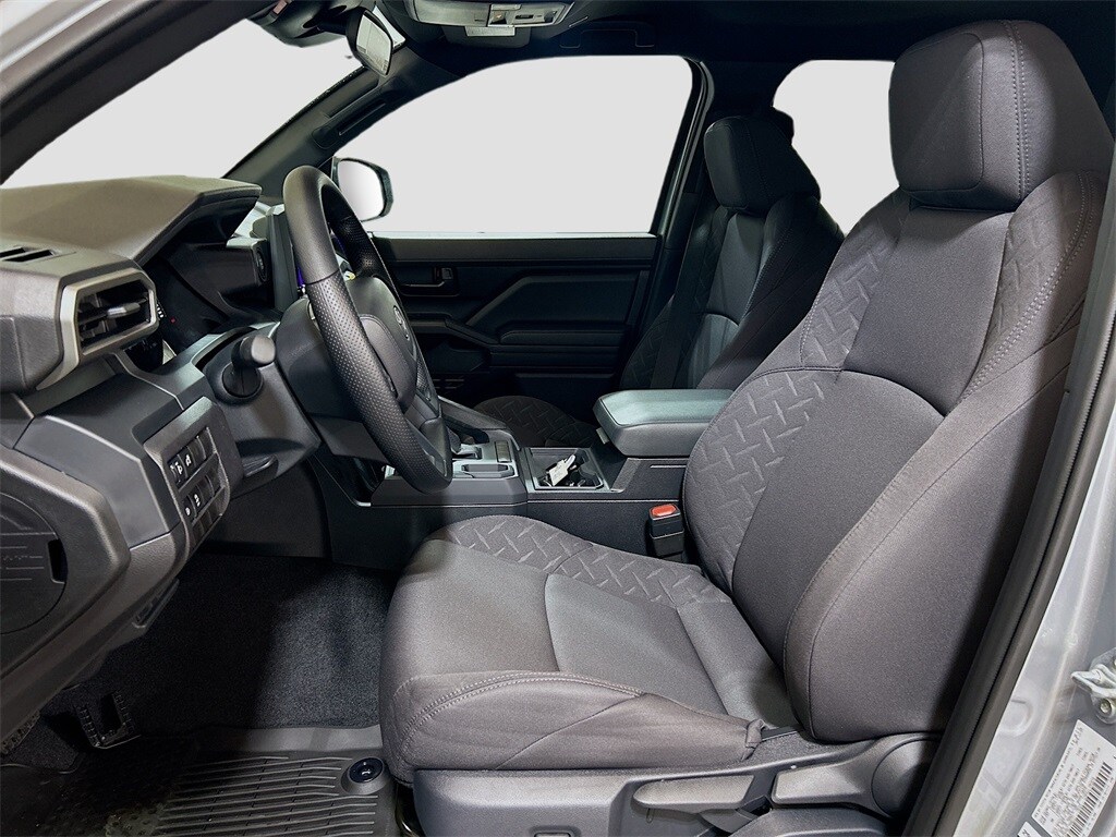 2026 Toyota Tacoma Celestial Silver Metallic RWD SR 8-Speed Automatic 2.4L 4-Cylinder 3.583 Axle Ratio, 4-Wheel Disc Brakes, 6 Speakers, ABS brakes, Air Conditioning, Alloy wheels, AM/FM radio: SiriusXM, Anti-whiplash front head restraints, Apple CarPlay/Android Auto, Auto High-beam Headlights, Brake assist, Bumpers: body-color, Driver door bin, Dual front impact airbags, Dual front side impact airbags, Electronic Stability Control, Emergency communication system: Safety Connect (up to 10-year trial subscription), Exterior Parking Camera Rear, Fabric Seat Trim, Front anti-roll bar, Front Bucket Seats, Front Center Armrest, Front reading lights, Front wheel independent suspension, Fully automatic headlights, Heated door mirrors, Illuminated entry, Knee airbag, Low tire pressure warning, Occupant sensing airbag, Outside temperature display, Overhead airbag, Overhead console, Passenger door bin, Power door mirrors, Power steering, Power windows, Radio: 8" Toyota Audio Multimedia, Rear step bumper, Rear window defroster, Remote keyless entry, Speed control, Speed-sensing steering, Split folding rear seat, Spray-on Bed Liner, Steering wheel mounted audio controls, Tachometer, Telescoping steering wheel, Tilt steering wheel, Traction control, Trip computer, Variably intermittent wipers, Wheels: 17" Styled Alloy.