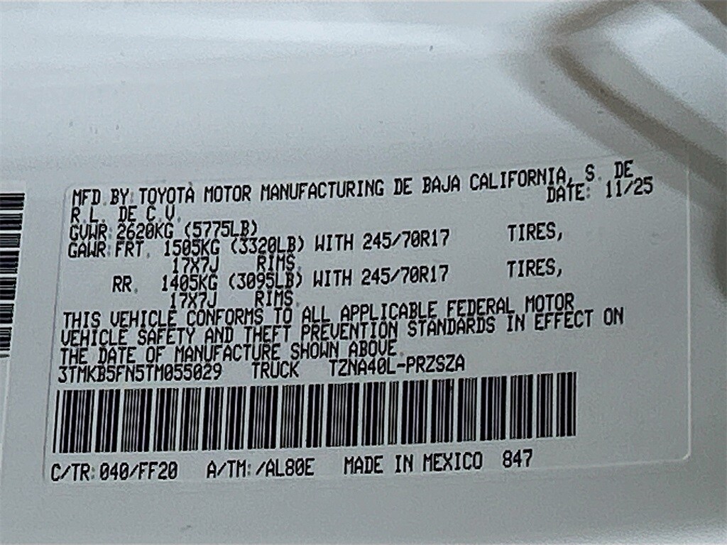 2026 Toyota Tacoma Ice Cap RWD SR5 8-Speed Automatic 2.4L 4-Cylinder 3.583 Axle Ratio, 4-Wheel Disc Brakes, 6 Speakers, ABS brakes, Air Conditioning, Alloy wheels, AM/FM radio: SiriusXM, Anti-whiplash front head restraints, Apple CarPlay/Android Auto, Auto High-beam Headlights, Auto-dimming Rear-View mirror, Brake assist, Bumpers: body-color, Driver door bin, Dual front impact airbags, Dual front side impact airbags, Electronic Stability Control, Emergency communication system: Safety Connect (up to 10-year trial subscription), Exterior Parking Camera Rear, Fabric Seat Trim, Four wheel independent suspension, Front anti-roll bar, Front Bucket Seats, Front Center Armrest, Front fog lights, Front reading lights, Fully automatic headlights, Heated door mirrors, Illuminated entry, Knee airbag, Low tire pressure warning, Occupant sensing airbag, Outside temperature display, Overhead airbag, Overhead console, Panic alarm, Passenger door bin, Power door mirrors, Power steering, Power windows, Radio: 8" Toyota Audio Multimedia, Rear step bumper, Rear window defroster, Remote keyless entry, Speed control, Speed-sensing steering, Split folding rear seat, Spray-on Bed Liner, Steering wheel mounted audio controls, Tachometer, Telescoping steering wheel, Tilt steering wheel, Traction control, Trip computer, Variably intermittent wipers, Wheels: 17" Styled Alloy.