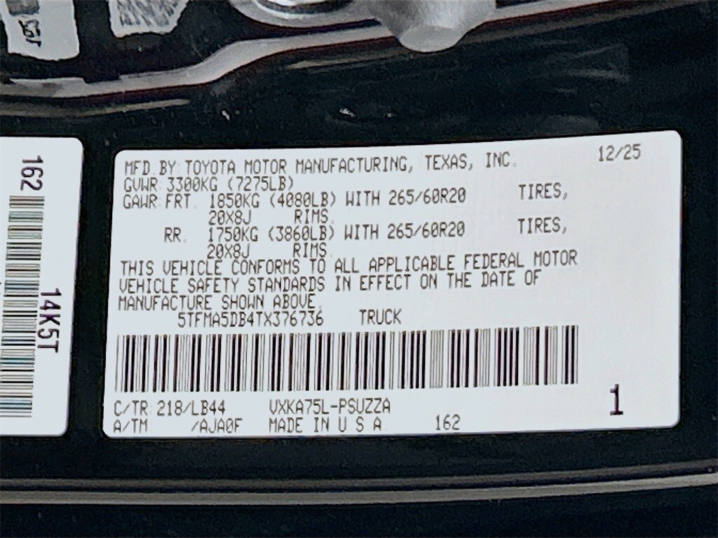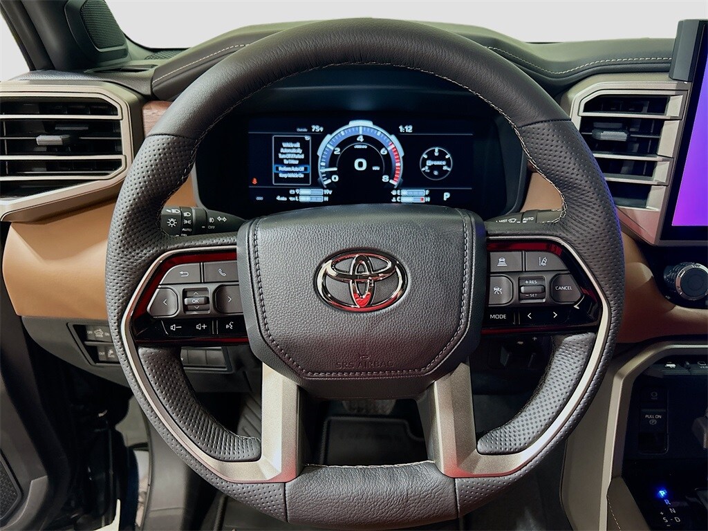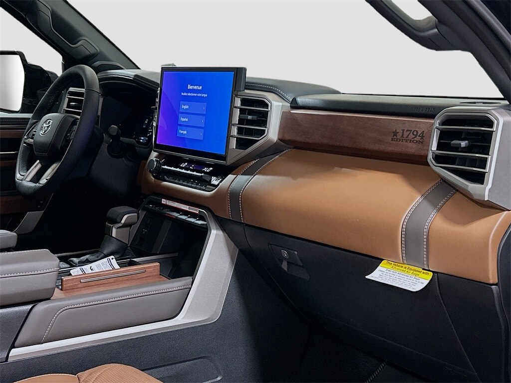2026 Toyota Tundra Midnight Black Metallic 4WD 1794 10-Speed Automatic 3.4L V6 4WD, Saddle Tan Leather, 10-Way Power Adjustable Heated and Ventilated Front Seats, 12 Speakers, 1794 Grade Package, 3.31 Axle Ratio, 4-Wheel Disc Brakes, ABS brakes, Air Conditioning, Alloy wheels, AM/FM radio: SiriusXM, Apple CarPlay/Android Auto, Auto High-beam Headlights, Auto-dimming door mirrors, Auto-dimming Rear-View mirror, Automatic temperature control, Blind Spot Monitor, Brake assist, Bumpers: body-color, Chrome Exhaust Tail Pipe & Diffuser, Chrome Plated Power Folding Outside Mirrors, Compass, Delay-off headlights, Driver door bin, Driver vanity mirror, Dual front impact airbags, Dual front side impact airbags, Electronic Stability Control, Emergency communication system: Safety Connect (up to 10-year trial subscription), Exterior Parking Camera Rear, Front anti-roll bar, Front Bucket Seats, Front Center Armrest, Front dual zone A/C, Front fog lights, Front reading lights, Front wheel independent suspension, Fully automatic headlights, Garage door transmitter: HomeLink, Head Up Display (HUD), Heated door mirrors, Heated front seats, Heated rear seats, Heated steering wheel, Illuminated entry, Knee airbag, Leather Shift Knob, Leather steering wheel, Low tire pressure warning, Memory seat, Multi-Terrain Back Monitor, Navigation system: Drive Connect Cloud Navigation (1-year trial subscription), Occupant sensing airbag, Outside temperature display, Overhead airbag, Overhead console, Panic alarm, Panoramic View Back Monitor, Passenger door bin, Passenger vanity mirror, Power door mirrors, Power driver seat, Power moonroof, Power passenger seat, Power Running Boards, Power steering, Power windows, Premium Leather Seat Trim, Radio data system, Radio: Premium Audio, Rain sensing wipers, Rear reading lights, Rear seat center armrest, Rear step bumper, Rear window defroster, Remote keyless entry, Safety Connect, Security system, Speed control, Speed-sensing steering, Speed-Sensitive Wipers, Split folding rear seat, Steering wheel memory, Steering wheel mounted audio controls, Tachometer, Telescoping steering wheel, Tilt steering wheel, Traction control, Trip computer, Turn signal indicator mirrors, Variably intermittent wipers, Ventilated front seats, Ventilated rear seats, Voltmeter, Wheel Locks, Wheels: 20" Machined Finish Alloy, 4WD, Saddle Tan Leather. Price includes: $3000 - TMS Customer Cash . Exp. 02/02/2026