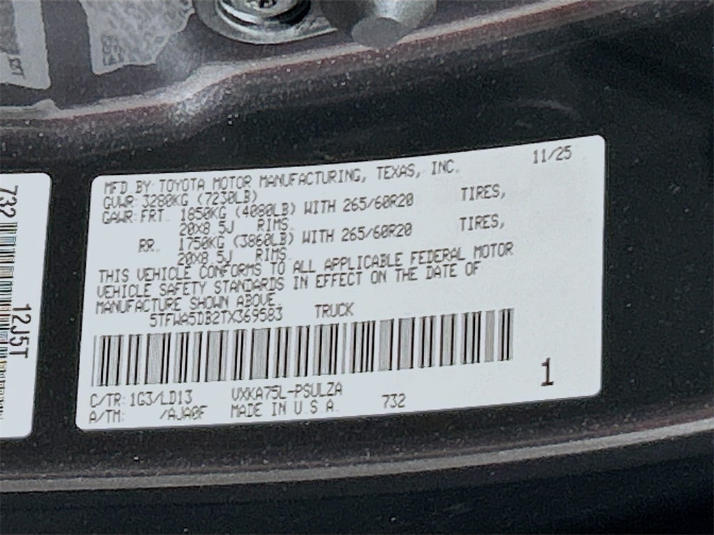 2026 Toyota Tundra Magnetic Gray Metallic 4WD Limited 10-Speed Automatic 3.4L V6 4WD, Boulder Leather, 120V Deck and Cabin Power Supply, 20" Alloy Wheels, 3.31 Axle Ratio, 4-Wheel Disc Brakes, 8-Way Power Adjustable Heated/Ventilated Front Seats, 9 Speakers, ABS brakes, Air Conditioning, Alloy wheels, AM/FM radio: SiriusXM, Apple CarPlay/Android Auto, Auto High-beam Headlights, Auto-dimming door mirrors, Auto-dimming Rear-View mirror, Automatic temperature control, Bed Step, Brake assist, Bumpers: body-color, Carpet Floor Mats, Delay-off headlights, Driver door bin, Driver vanity mirror, Dual front impact airbags, Dual front side impact airbags, Dual-Step Running Board - Black, Electronic Stability Control, Emergency communication system: Safety Connect (up to 10-year trial subscription), Exterior Parking Camera Rear, Front anti-roll bar, Front Bucket Seats, Front Center Armrest, Front dual zone A/C, Front fog lights, Front reading lights, Front wheel independent suspension, Fully automatic headlights, Garage door transmitter: HomeLink, Heated door mirrors, Heated front seats, Illuminated entry, Knee airbag, Leather Seat Trim, Leather Shift Knob, Leather steering wheel, Low tire pressure warning, Memory seat, Navigation system: Drive Connect Cloud Navigation (1-year trial subscription), Occupant sensing airbag, Outside temperature display, Overhead airbag, Overhead console, Panic alarm, Passenger door bin, Passenger vanity mirror, Power door mirrors, Power driver seat, Power Package, Power passenger seat, Power steering, Power windows, Radio data system, Radio: Audio Plus, Rear reading lights, Rear seat center armrest, Rear step bumper, Rear window defroster, Remote keyless entry, Safety Connect, Security system, Speed control, Speed-sensing steering, Split folding rear seat, Steering wheel mounted audio controls, Tachometer, Telescoping steering wheel, Tilt steering wheel, Traction control, Trip computer, Turn signal indicator mirrors, Variably intermittent wipers, Ventilated front seats, Voltmeter, Wireless Charger, 4WD, Boulder Leather. Price includes: $1000 - TMS Customer Cash . Exp. 01/05/2026