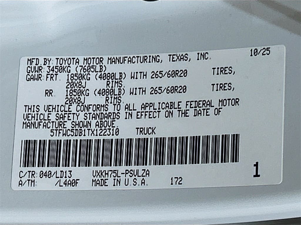 2026 Toyota Tundra Hybrid Ice Cap 4WD Limited 10-Speed Automatic 3.4L V6 3.4L V6, 20" Alloy Wheels, 3.31 Axle Ratio, 4-Wheel Disc Brakes, 400W/120V AC Rear Seat & Bed Power Supply, 9 Speakers, ABS brakes, Air Conditioning, Alloy wheels, AM/FM radio: SiriusXM, Apple CarPlay/Android Auto, Auto High-beam Headlights, Auto-dimming door mirrors, Auto-dimming Rear-View mirror, Automatic temperature control, Bed Step, Black Overfenders and Rear Bumper, Blind Spot Monitor, Brake assist, Bumpers: body-color, Delay-off headlights, Driver door bin, Driver vanity mirror, Dual front impact airbags, Dual front side impact airbags, Dual-Step Running Board - Black, Electronic Stability Control, Emergency communication system: Safety Connect (up to 10-year trial subscription), Exterior Parking Camera Rear, Front anti-roll bar, Front Bucket Seats, Front Center Armrest, Front dual zone A/C, Front fog lights, Front reading lights, Front wheel independent suspension, Fully automatic headlights, Garage door transmitter: HomeLink, Heated and Ventilated Front Bucket Seats, Heated door mirrors, Heated front seats, Heated Leather Steering Wheel, Heated Power-Folding Color-Keyed Outer Mirrors, Heated steering wheel, High Grade Full LED Headlamp, Illuminated entry, JBL Premium Audio, Knee airbag, Leather Seat Trim, Leather Shift Knob, Leather steering wheel, Limited Power Package, Limited Premium Package, Limited PVM Package, Low tire pressure warning, Memory seat, Multi-Terrain Back Monitor, Navigation system: Drive Connect Cloud Navigation (1-year trial subscription), Nightshade Package, Occupant sensing airbag, Outside temperature display, Overhead airbag, Overhead console, Panic alarm, Panoramic Sun Roof, Panoramic View Monitor, Passenger door bin, Passenger vanity mirror, Power door mirrors, Power driver seat, Power passenger seat, Power steering, Power windows, Qi-Compatible Wireless Smartphone Charging, Radio data system, Radio: Audio Plus, Rear reading lights, Rear seat center armrest, Rear step bumper, Rear window defroster, Remote keyless entry, Security system, Speed control, Speed-sensing steering, Split folding rear seat, Steering wheel mounted audio controls, Tachometer, Telescoping steering wheel, Tilt steering wheel, Towing Technology Package, Traction control, Trip computer, Turn signal indicator mirrors, Variably intermittent wipers, Ventilated front seats, Voltmeter, Wheels: 20" Matte-Black Alloy, 3.4L V6. Price includes: $3000 - TMS Customer Cash . Exp. 02/02/2026