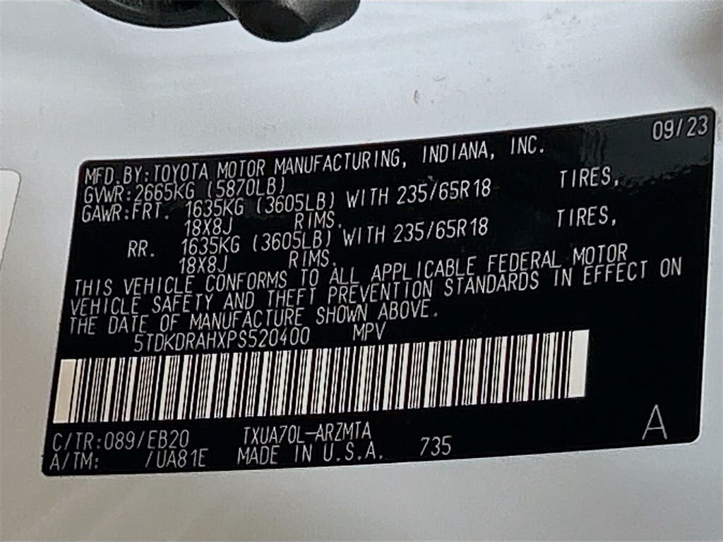 18" Painted Alloy Wheels, 3.329 Axle Ratio, 3rd row seats: split-bench, 4-Wheel Disc Brakes, 6 Speakers, ABS brakes, Air Conditioning, Alloy wheels, AM/FM radio: SiriusXM, Apple CarPlay/Android Auto, Auto High-beam Headlights, Automatic temperature control, Brake assist, Bumpers: body-color, Delay-off headlights, Driver door bin, Driver vanity mirror, Dual front impact airbags, Dual front side impact airbags, Electronic Stability Control, Emergency communication system: Safety Connect (up to 10-year trial subscription), Engine Immobilizer, Exterior Parking Camera Rear, Fabric Seat Trim, Four wheel independent suspension, Front anti-roll bar, Front Bucket Seats, Front Center Armrest, Front dual zone A/C, Front reading lights, Fully automatic headlights, Heated door mirrors, Illuminated entry, Knee airbag, Low tire pressure warning, Occupant sensing airbag, Outside temperature display, Overhead airbag, Overhead console, Panic alarm, Passenger door bin, Passenger vanity mirror, Power door mirrors, Power driver seat, Power steering, Power windows, Radio: 8" Toyota Audio Multimedia, Rear air conditioning, Rear anti-roll bar, Rear reading lights, Rear seat center armrest, Rear window defroster, Rear window wiper, Reclining 3rd row seat, Remote keyless entry, Speed control, Speed-sensing steering, Split folding rear seat, Spoiler, Steering wheel mounted audio controls, Tachometer, Telescoping steering wheel, Tilt steering wheel, Traction control, Trip computer, Turn signal indicator mirrors, Variably intermittent wipers.